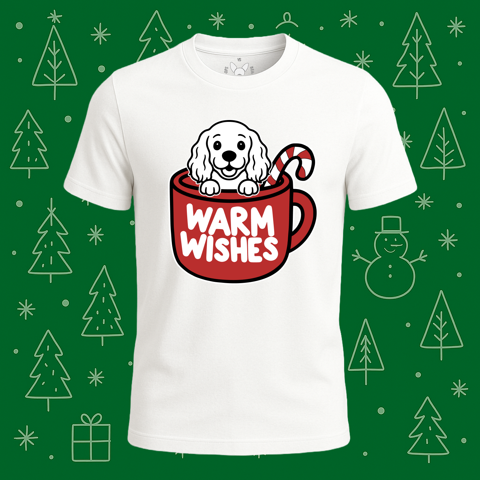 A cozy and festive tee featuring a cheerful Cocker Spaniel peeking out from a giant holiday mug filled with warm wishes. Perfect for dog lovers who want to spread good vibes all season long, whether you’re sipping coffee, walking your pup, or lounging at home.