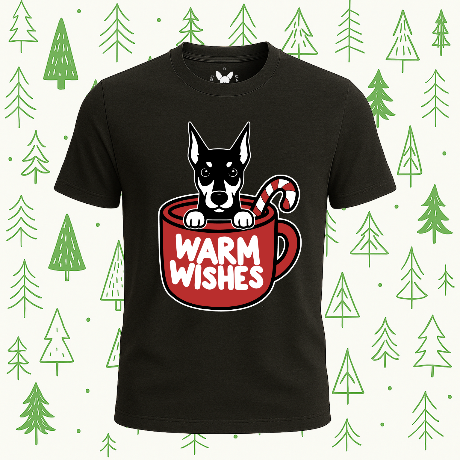 A cozy and festive tee featuring a cheerful Doberman peeking out from a giant holiday mug filled with warm wishes. Perfect for dog lovers who want to spread good vibes all season long, whether you’re sipping coffee, walking your pup, or lounging at home.