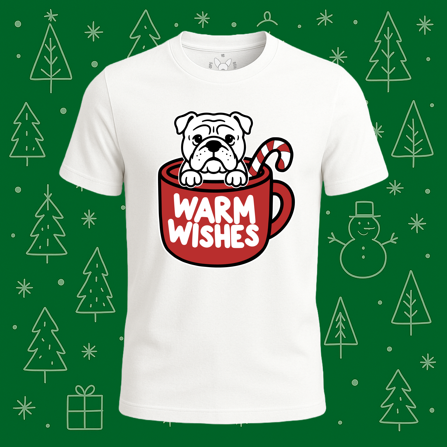 A cozy and festive tee featuring a cheerful English Bulldog peeking out from a giant holiday mug filled with warm wishes. Perfect for dog lovers who want to spread good vibes all season long, whether you’re sipping coffee, walking your pup, or lounging at home.