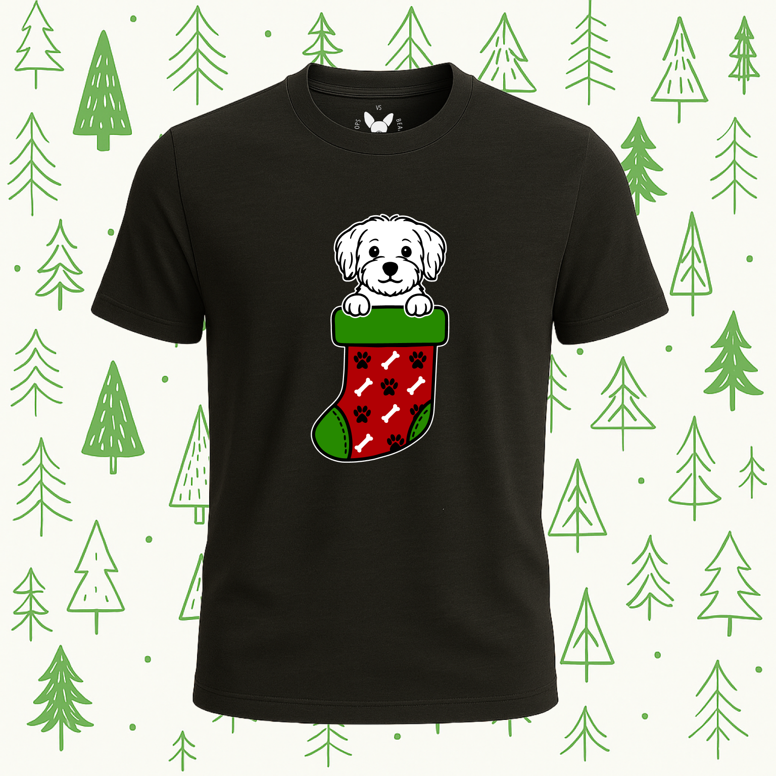 Sweet, snuggly, and full of seasonal charm, this tee features your favorite Boops Vs Beans pup peeking out of a festive holiday stocking decorated with adorable dog-themed patterns. From little paw prints to tiny bones, the design gives the classic stocking a playful, pup-approved twist that makes you instantly feel the warmth of the season