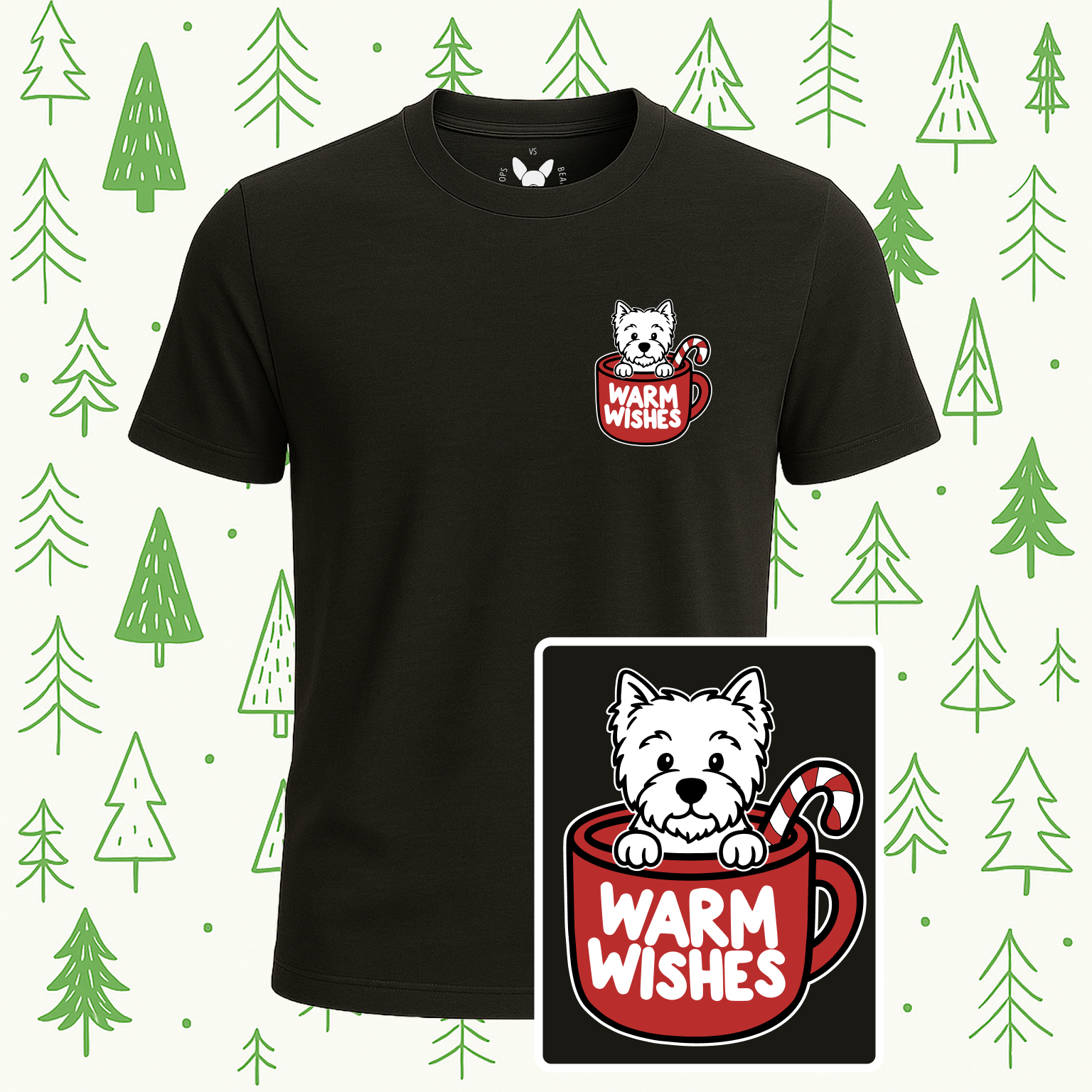 A cozy and festive tee featuring a cheerful West Highland Terrier (Westie) peeking out from a giant holiday mug filled with warm wishes. Perfect for dog lovers who want to spread good vibes all season long, whether you’re sipping coffee, walking your pup, or lounging at home.